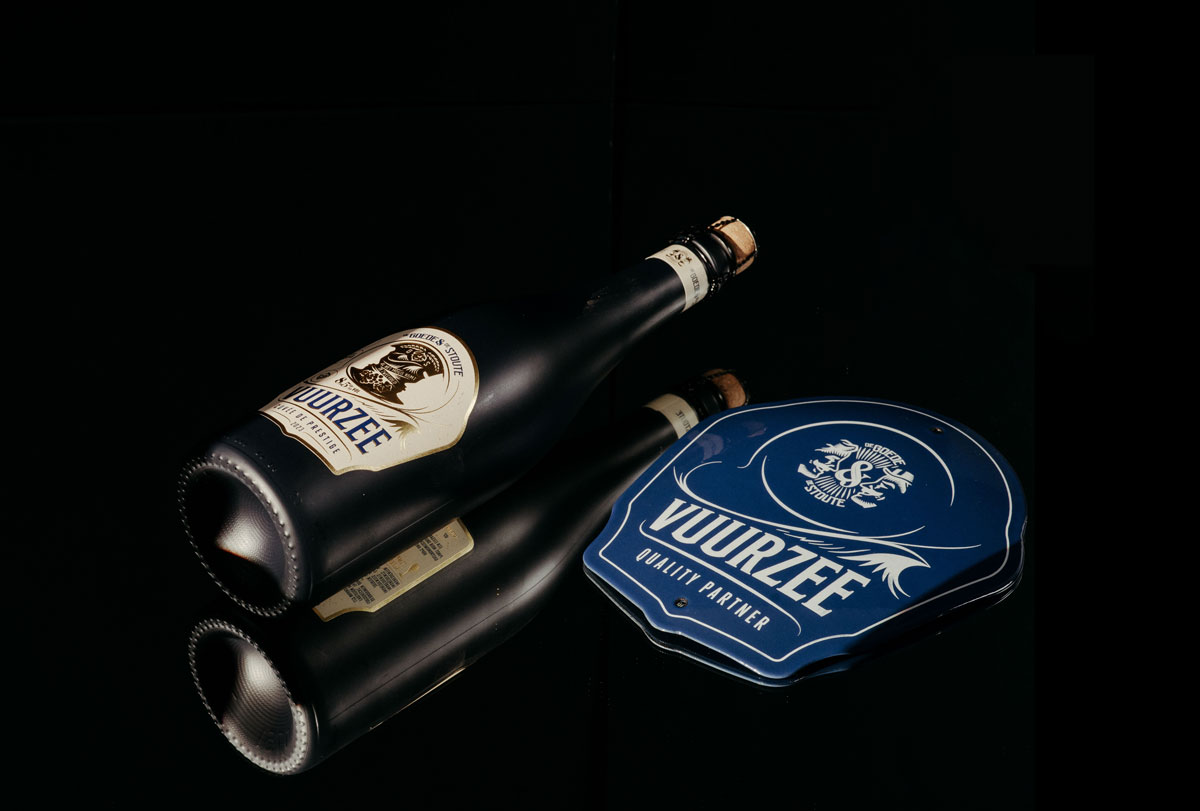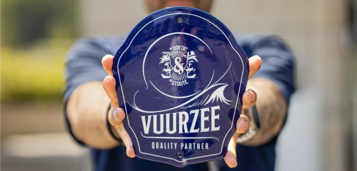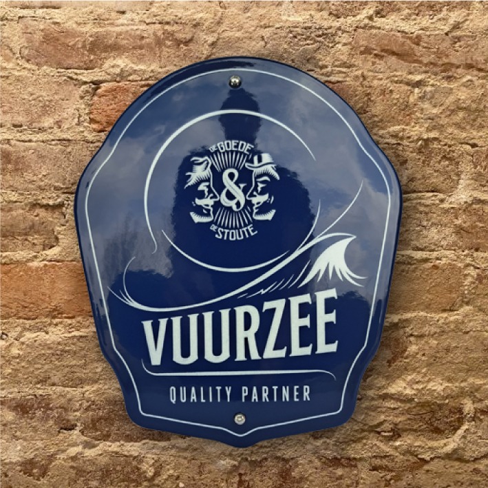 Vuurzee, an elegant mix between beer and Champagne with the addition of the skin of a Pinot Noir. A drink of this level naturally deserves a beautiful enamel sign for its 'Quality partners'. At Goede & de Stoute, they clearly know how to distinguish themselves.